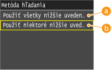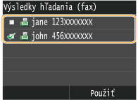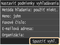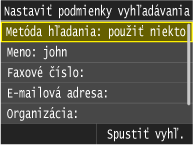 Ako podmienky pre vyhľadanie miest určenia sú k dispozícii mená osôb, faxové čísla, e-mailové adresy, názvy organizácií a názvy oddelení. Naraz môžete špecifikovať viacero podmienok vyhľadávania.