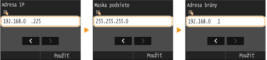 <Maska podsiete> <Adresa brány>.Zadajte nastavenie pomocou číselných tlačidiel a na každej obrazovke poklepte na položku <Použiť>.
