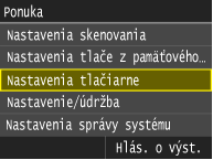 Dostupnosť nastaveníVšetky nastavenia tlačiarne opísané v tejto časti okrem možnosti <Nedbať na formát pap.> (Nedbať na formát pap.) sú dostupné iba pre tlač PCL. Špecifikácia týchto nastavení nie je potrebná napríklad vtedy, keď tlačíte pomocou ovládača tlačiarne UFRII.