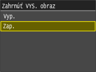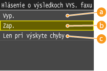 Keď pre <Zap.> vyberiete voľbu <Len pri výskyte chyby> alebo <Hlásenie o výsledkoch VYS. faxu>, hlásenie môže obsahovať časť faxového dokumentu. Nastavte voľbu <Zahrnúť VYS. obraz> na <Zap.>.