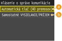 Môžete skontrolovať výpisy odoslaných a prijatých dokumentov faxu a e-mailu tak, že vytlačíte Hlásenie o správe komunikácie. Hlásenie sa môže tlačiť automaticky po každých 40 prenosoch alebo ho môžete vytlačiť manuálne.