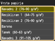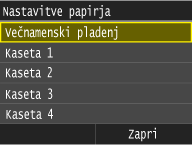 Ko registrirate privzeto nastavitev papirja, se pri nalaganju papirja ne prikaže zaslon za nastavitev papirja, saj se vedno uporabi ista nastavitev. Če naložite drugo velikost ali vrsto papirja in ne spremenite nastavitev papirja, naprava morda ne bo tiskala pravilno. Temu se izognete tako, da v 3. koraku izberete <Izključeno> in tako onemogočite privzeto nastavitev, nato pa naložite papir.