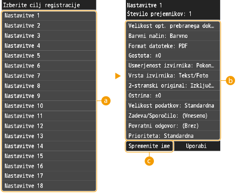 <Nastavitve Priljubljeno> <Sprem./Izbris> <Izbriši> tapnite nastavitve za urejanje <Da>.Če želite uporabiti registrirano nastavitev, tapnite <Opt. branje>