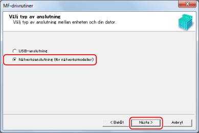 Om följande fönster visas, välj [Nätverksanslutning (för nätverksmodeller)] → klicka på [Nästa].