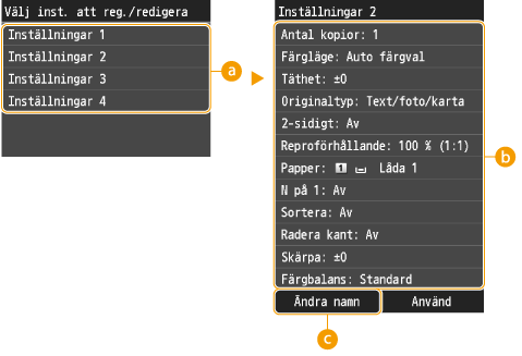 Du kan registrera upp till fyra vanliga kombinationer av kopieringsinställningar. Du kan, genom att välja en registrerad inställningskombination när den behövs, slippa göra samma inställningar varje gång du gör kopior. Du kan till exempel ange 5 som antal kopior, ställa in <Radera kant> på <På> och öka skärpan när du kopierar. Du kan registrera inställningskombinationerna med valfritt namn.