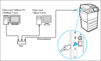 Anslut enheten till en dator via en router. Använd en nätverkskabel för att ansluta enheten till routern.