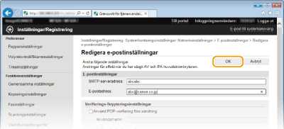 Du måste kanske ändra SMTP- eller POP3-portinställningarna beroende på vilket nätverk du använder ( Ändra portnummer). Om du vill ha mer information kontaktar du Internetleverantören eller nätverksadministratören.