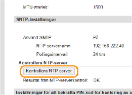 [Nätverksinställningar] [TCP/IP-inställningar] och klicka på [Kontrollera NTP-server] i [SNTP-inställningar]. Om en korrekt anslutning har upprättats visas resultatet enligt nedan. Den här åtgärden justerar inte systemklockan.![]() |