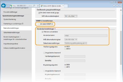 Markera kryssrutan [Aktivera användare] och ange inställningar för [Användarnamn], [MIB-åtkomstbehörighet] och [Säkerhetsinställningar].
