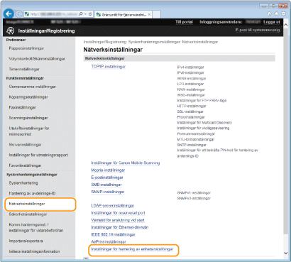 Om du vill aktivera reserverade portinställningar och SNMP-inställning (antingen SNMPv1 eller SNMPv3) för att kunna kommunicera med ett iW Management Console plugin-program. Välj [Läs-/skrivbar] (behörighet till) för [MIB-åtkomstbehörighet] i SNMP-inställning (antingen SNMPv1 eller SNMPv3). Inställn. för reserverad port Övervaka och styra enheten med SNMP