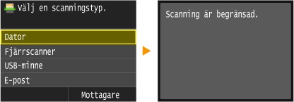 Ange övre gräns i [Antal sidor]. Om kryssrutan [Begränsa skanning] har markerats inaktiveras skanning av dokument till USB-minnet, e-post, delade mappar och filservrar. Du kan också begränsa skanning av dokument till datorer via <Dator> och <Fjärrscanner>. Du kan emellertid bara begränsa skanning av dokument till datorer för alla användare (Blockera jobb när avdelnings-ID är okänt).