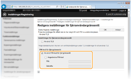 <Systemhanteringsinställningar> <Inställningar för fjärranvändargränssnitt> <Inställn. för åtkomstsäkerhet för fjärrgränssnitt> <På> Ange PIN-kod <Använd> Ange PIN-kod (Bekräfta) <Använd>.Om inställningar för Fjärranvändargränssnittet har initieratsPIN-koden för Fjärranvändargränssnittet har också initierats. Återställ PIN-koden efter initieringen. Initiera meny