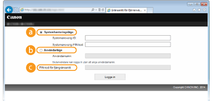 Du har tillgång till alla åtgärder och inställningar i Fjärranvändargränssnittet. Ange lämpligt ID i [Systemansvarig-ID] och PIN-kod i [Systemansvarig-PIN-kod] (