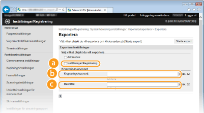 Du kan spara inställningsdata för menyalternativ på datorn eller registrera sparade data i enheten. Exporterade data kan importeras. Om du använder samma modell kan andra enheter importera data som exporterats från den här enheten och tvärtom. Dessa funktioner kan bara utföras om du har loggat in i systemhanteringsläge.