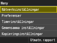 Alla inställningar för nätverket visas med korta beskrivningar. Standardinställningarna markeras med ett kors (