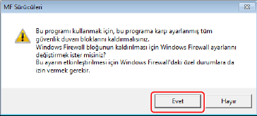 Yükleme sırasında aşağıdaki iletişim kutusu gösterilirse [Evet] düğmesini seçin. Windows Güvenlik Duvarı engeli kaldırılır ve yüklemeye devam edebilirsiniz.
