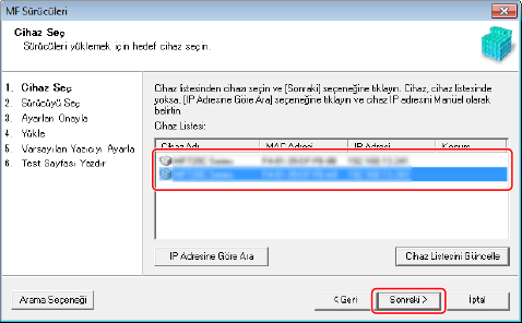 Aygıt [Cihaz Listesi] alanında gösterilmezse bilgisayar ile aygıt arasındaki bağlantı durumunu ve IP adresi ayarlarını tıklatın ve [Cihaz Listesini Güncelle] öğesini tıklatın. Aygıt yine de gösterilmezse [IP Adresine Göre Ara] öğesini tıklatın → aygıtın IP adresini girin → [Tamam] düğmesini tıklatın. IP adresi onay yöntemi için, aygıtın kılavuzuna bakın.