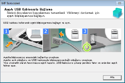 USB kablosunu ekrandaki talimatlara göre bağlayın. USB kablosunu bağlayıp yüklediyseniz USB kablosunu çıkarıp tekrar yükleyin. Ayrıca USB kablosu bu ürünle birlikte verilmez. Ayrı olarak hazırlayın.