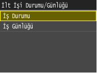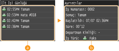 ![]() <İlt İşi Günlüğü>/<Alım İş Günlüğü>Gönderilen ve alınan belgelerin listesini görüntüler. <Tamam> bir belge başarıyla gönderildiğinde veya alındığında görüntülenir ve <Hata>, iptal edildiği ya da hata oluştuğu için belge gönderilemediğinde veya alınamadığında görüntülenir.