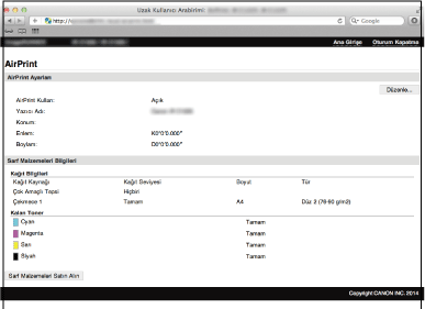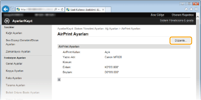 Makinenin adı ve kurulum yeri de dahil olmak üzere, makineyi tanımlamak için kullanılan bilgileri kaydedebilirsiniz. Makinenin AirPrint işlevini devre dışı da bırakabilirsiniz. Bu ayarları değiştirmek için Uzak Kullanıcı Arabirimi'ni kullanın.