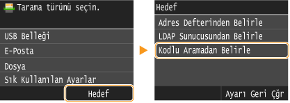 Adres Defteri, kayıtlı hedefler listesinden seçerek veya alıcı adlarını içeren hedefleri ada göre arayarak bir hedef belirtmenize olanak sağlar. Bir hedefe atanmış üç basamaklı bir sayı (kodlu arama numaraları) girerek doğrudan bir hedef de belirtebilirsiniz.