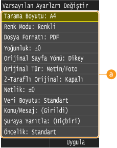 tuşuna bastığınızda görüntülenen ayarlardır. Bu varsayılan ayarları, sıkça gerçekleştirdiğiniz işlemlerle eşleşecek şekilde değiştirirseniz, tarama yaptığınız her seferde aynı ayarları yapılandırma gereksinimini ortadan kaldırabilirsiniz.
