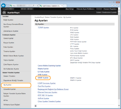 İşletim panelini kullanmaSNMP ayarlarını <Menü> aracılığıyla etkinleştirebilir veya devre dışı bırakabilirsiniz. SNMP Ayarları