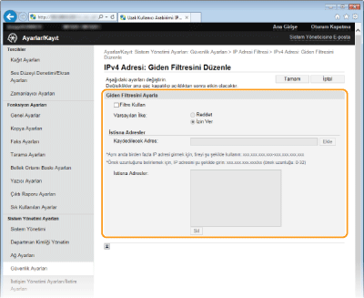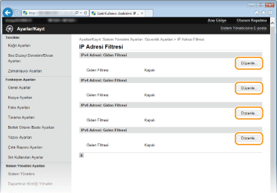 IP Adresi Filtresi ayarlarını <Menü> tuşuna basarak etkinleştirebilir veya devre dışı bırakabilirsiniz. IPv4 Adres Filtresi IPv6 Adres Filtresi