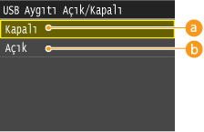 Makinenin arka tarafında bulunan USB bağlantı noktasını devre dışı bırakabilirsiniz. Bu bağlantı noktası devre dışı bırakılırsa, makine USB aracılığıyla bir bilgisayarla iletişim kuramaz. Bu ayar, USB bellek aygıtlarının bağlanması için tasarlanmış olan ön USB bağlantı noktasını etkilemez.
