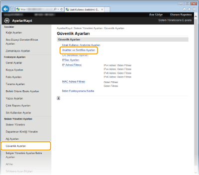 [Anahtar ve Sertifika Ayarları] öğesini tıklatın.