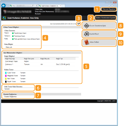 Makinenin geçerli durumunu ve hata bilgilerini görüntüler. Bir hata oluştuysa, Hata Bilgileri sayfasının bağlantısı görüntülenir.