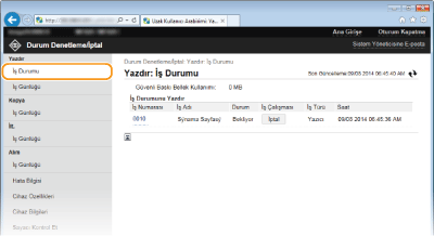 Ayrıntılı bilgileri görüntülemek için duraklatılan belgelerde ve güvenli belgelerde [İş Numarası] öğesini tıklatın. Yazdırılan belgenin kullanıcı adını ve sayfa sayısını denetleyebilirsiniz.
