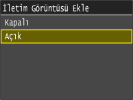 <Açık> için <Sadece Hata Oluştuğunda> veya <Faks İlt. Sonucu Raporu> seçeneğini belirlediğinizde faks belgesinin bir kısmı rapora eklenebilir. <İletim Görüntüsü Ekle> seçeneğini <Açık> olarak ayarlayın.