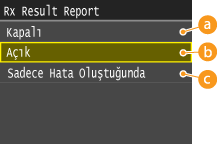 Alınan faks belgelerinin günlüklerini bir Alım Sonucu Raporu yazdırarak denetleyebilirsiniz. Rapor, tamamlanan her iletimden sonra veya yalnızca alma hatası oluştuğunda yazdırılabilir.