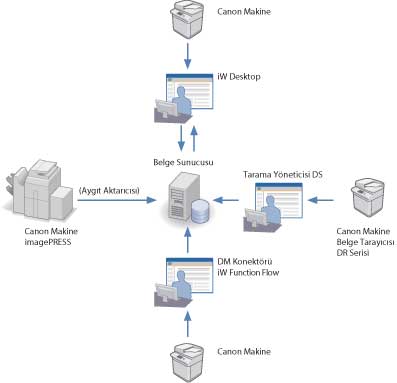 iW Scan Manager DS ile aktarılan belgeler farklı iş durumlarında kullanılan temel iW serisi yazılım ürünü olan "Belge Sunucusu"na bırakılabilir.