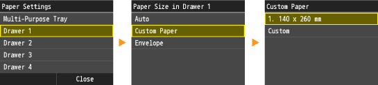 Щоб вказати формат паперу, завантаженого в шухляди для паперу, на екрані виберіть потрібний варіант зі списку зареєстрованих форматів паперу. Зазначення типу паперу, завантаженого в шухляду для паперу
