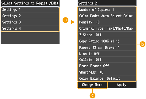 Можна реєструвати до чотирьох часто використовуваних комбінацій параметрів копіювання. За необхідності достатньо вибрати зареєстровану комбінацію параметрів, і таким чином, не потрібно щоразу вводити ті самі параметри для копіювання, наприклад вказувати кількість копій до 5, установлювати для параметра <Erase Frame> значення <On> та збільшувати різкість під час копіювання. Для комбінації параметрів можна зареєструвати будь-яку назву.