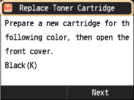 На дисплеї буде відображено інформацію про колір тонера, якого необхідно замінити. Якщо необхідно замінити кілька картриджів із тонером, замініть картриджі з тонером у такій послідовності: чорний, жовтий, пурпуровий, блакитний.