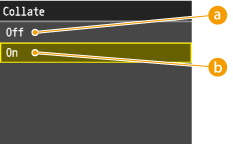 عند إعداد نسخ متعددة من مستندات صفحة متعددة، اضبط <Collate> على <On> لترتيب النسخ بترتيب الصفحات التسلسلي. وهذه الوظيفة مفيدة عند إعداد المطبوعات للاجتماعات أو العروض التقديمية.