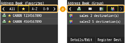 يمكنك دفتر العناوين من تحديد أي وجهة عن طريق التحديد من قائمة الوجهات المسجلة أو عن طريق البحث حسب الاسم للوجهات مع أسماء المستلمين. ويمكنك أيضًا تحديد وجهة مباشرة من خلال إدخال رقم مكون من ثلاثة أعداد (رقم طلب مرمز) تم تخصيصه لوجهة.