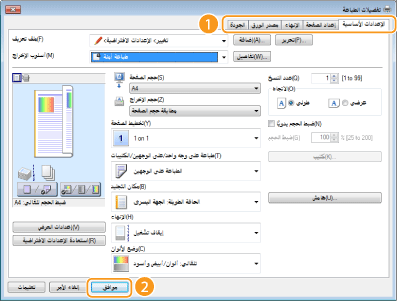 انقر فوق علامات التبويب [الإعدادات الأساسية] أو [إعداد الصفحة] أو [الإنهاء] أو [مصدر الورق] أو [الجودة] لتحديد إعدادات الطباعة في كل شاشة بحسب الحاجة.