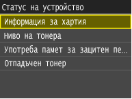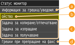 , се извежда екран, чрез който можете да проверите статуса на документи, които се отпечатват, изпращат или получават, както и статуса на устройството, като например нивата на тонера или настройките на мрежата, например IP адреса на устройството.