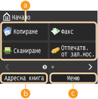 на работния панел. Бутони за достъп до функциите се извеждат в началния екран. Можете да добавите/изтривате бутони от началния екран и да промените подредбата им, така че да са по-удобни за използване.