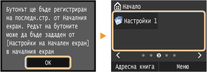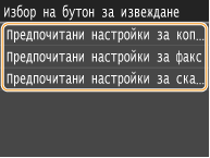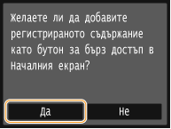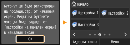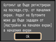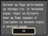 Ако често използваните настройки са изтрити или преименувани чрез Remote UI (Потребителски интерфейс за отдалечено управление), докосването на бутона на началния екран няма да изведе настройките. Отменете извеждането на бутона на началния екран и след това го запаметете отново с ново име, ако е необходимо.