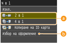 , но ръбовете на документа може да не бъдат копирани, ако го увеличите.<2 в 1>/<4 в 1> не е достъпно, когато се използва <Изтриване на рамка> и <Копиране на ID карта>.