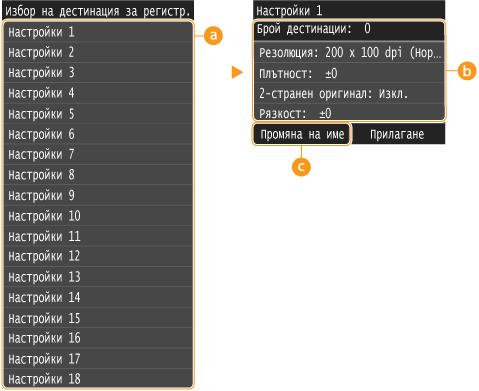 Ако дестинацията, запаметена в настройка е изтрито от адресната книга, то също се изтрива от запаметената настройка.