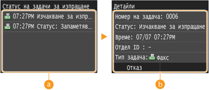 <Детайли>Извежда подробна информация за документа, избран от списъка. Ако сте задали множество дестинации, броят на зададените дестинации се извежда на екрана. За да проверите подробности за зададени множество дестинации, докоснете <Брой дестинации>. Ако попаднете на ненужен документ, докоснете <Отказ> или <Изтриване> и докоснете <Да>.