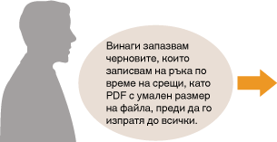Запаметете комбинация от имейл адреси и файлов формат, като например <PDF (Компактен)>, във <Предпочитани настройки>. След това можете лесно да използвате тази комбинация от настройки, когато имате нужда от нея. Запаметяване на често използвани настройки за сканиране (Имейл/споделена папка/файлов сървър)