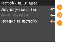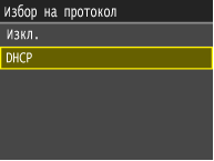 ![]() ![]() Ако не желаете да използвате DHCP сървър за присвояване на IP адрес Изберете <Изкл.>. Ако изберете <DHCP>, когато услугата е недостъпна, машината ще изгуби време и комуникационни ресурси, за да търси тази услуга в мрежата. |