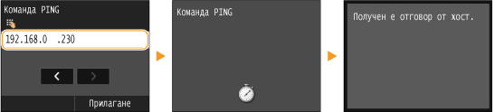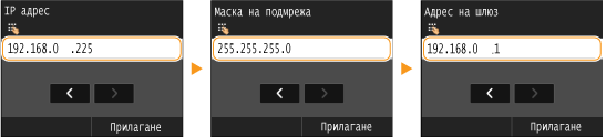 <Маска на подмрежа> <Адрес на шлюз>.Въведете настройката чрез бутоните с цифри и докоснете <Прилагане> във всеки екран.
